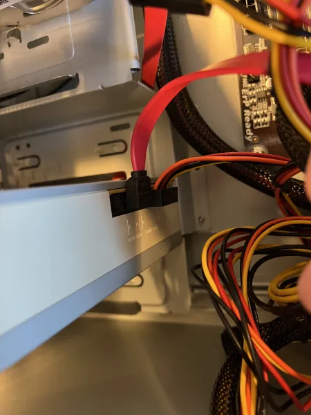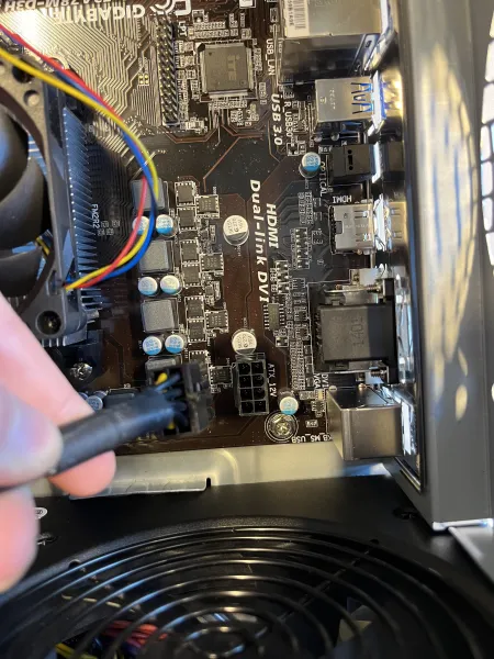 Etter du er ferdig med SATA koblingane skal du skru på PSU-en tilbake igjen, det kjem ann på kor PSU-en din skal ligge, men etter du har såtte den inn skur du en med 4 skurer på dei riktige plassene. Hugs å tilkoble PSU-en din til hovudkortet med ein (8-pinnars) ATX kobling.
