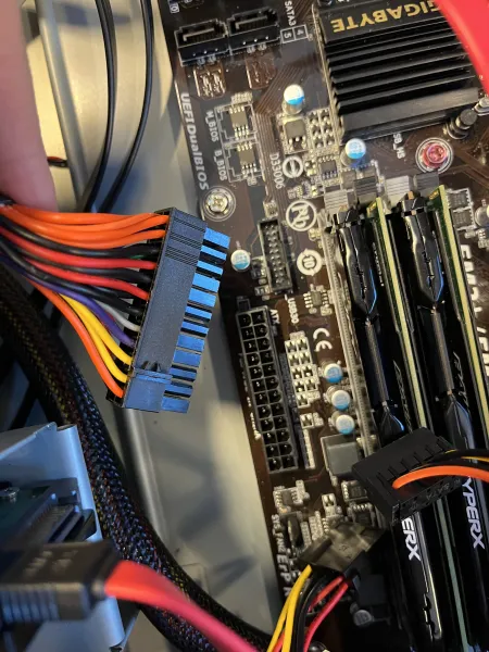 Etterpå skal du koble på alle ATX tilkoblingane som du har inn i pcen din, i min pc var det ein (SATA 15-pinnars) kobling i DVD-en og ein til (SATA 15-pinnars) inn i harddisken. Det var og ein 24 pinnars ATX tilkobling på hovudkortet som kjem frå PSU-en.
